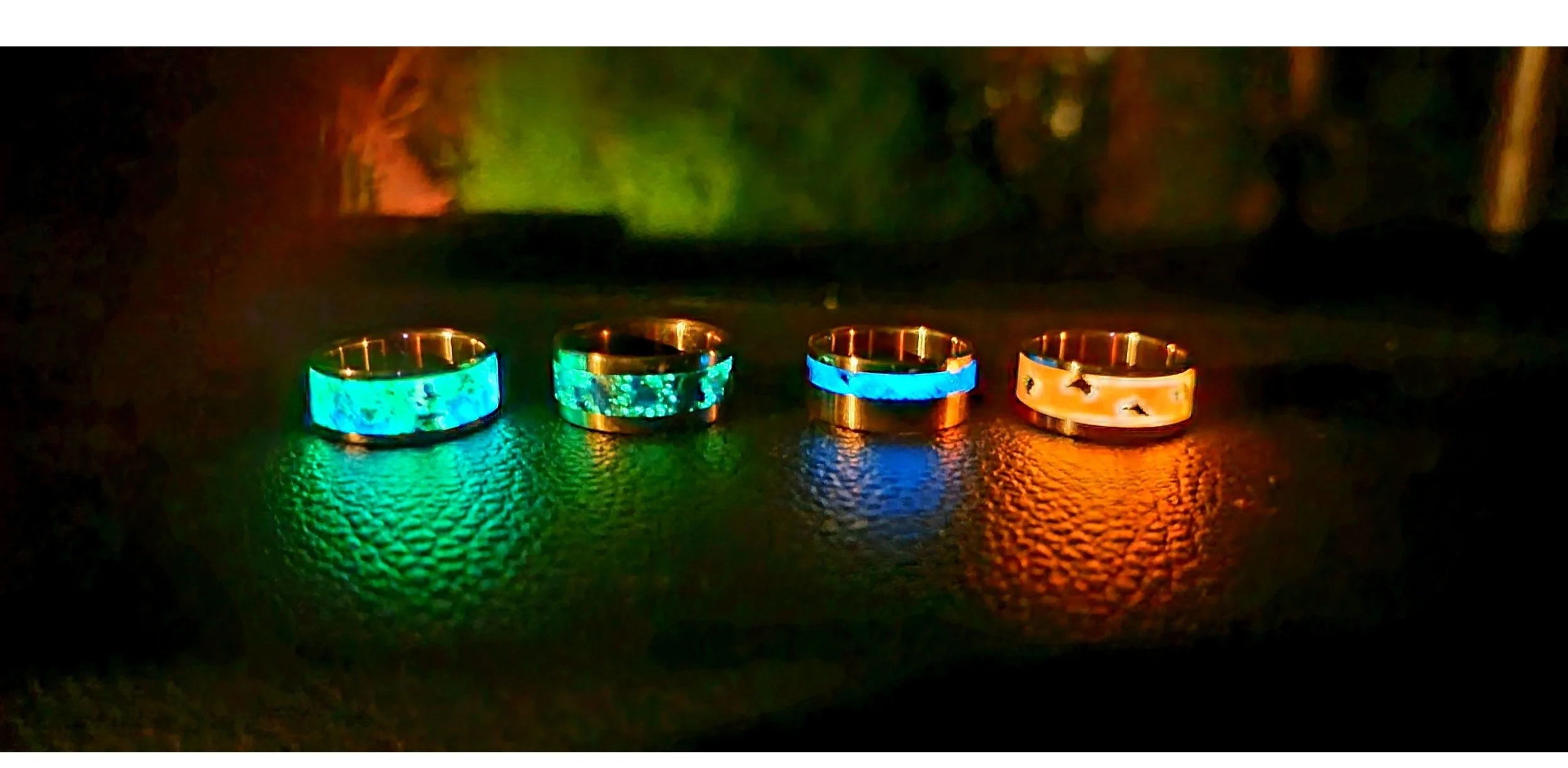 These bands can be Multi-piece, or single piece, with one or multiple channels in the ring body that allow a vast array of different types of materials to be inlayed. With a glow powder base, and your choice of Opal, or any other semi-precious stone to be inlayed, these rings are head turners.